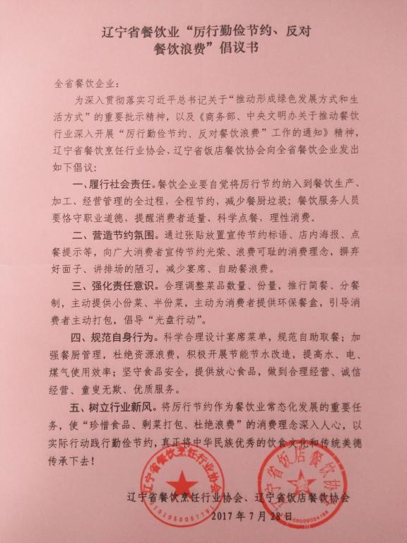 2017年8月31日9时,辽宁省“厉行勤俭节约、反对餐饮浪费”宣传周启动仪式在辽宁大厦一楼多功能厅举行,财务部经理梁晓非、库管刘颖代表涵月宾馆参加了这次活动。活动中,涵月宾馆接受了辽宁省餐饮烹饪行业协会、辽宁省饭店餐饮协会联合发出的《辽宁省餐饮业“厉行勤俭节约、反对餐饮浪费”倡议书》,并响应倡议书中的倡议内容,在全宾馆范围内开展“厉行勤俭节约、反对餐饮浪费”专题培训、张贴节约海报、号召从业人员提醒消费者适量点餐等活动,以实际行动践行勤俭节约,将中华民族优秀的饮食文化和传统美德传承下去。
